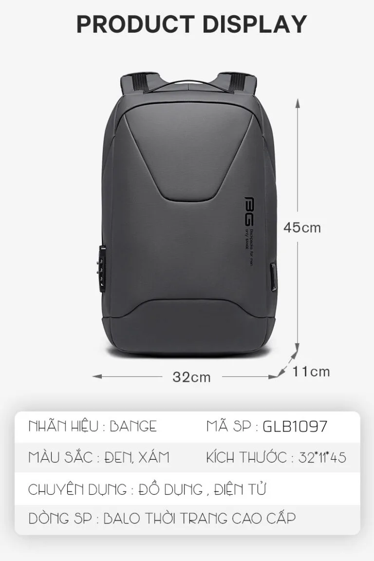 Với kích thước khá tương đối phần lưng của nam giới 32 cm x 11 cm x 45 cm, balo Bange Roy luôn tạo sự cân đối cơ thể khiến người đeo cảm thấy thoải mái và dễ chịu. Được phủ một gam màu đen nhưng lại toát lên cảm giác đơn giản nhưng không kém phần sang trọng, đẳng cấp. Phía trước được in hình logo thương hiệu Bange cũng khá đẹp và bắt mắt. Form dáng hình chữ nhật phù hợp với người mang và chứa đựng các thiết bị, vật dụng cần thiết.