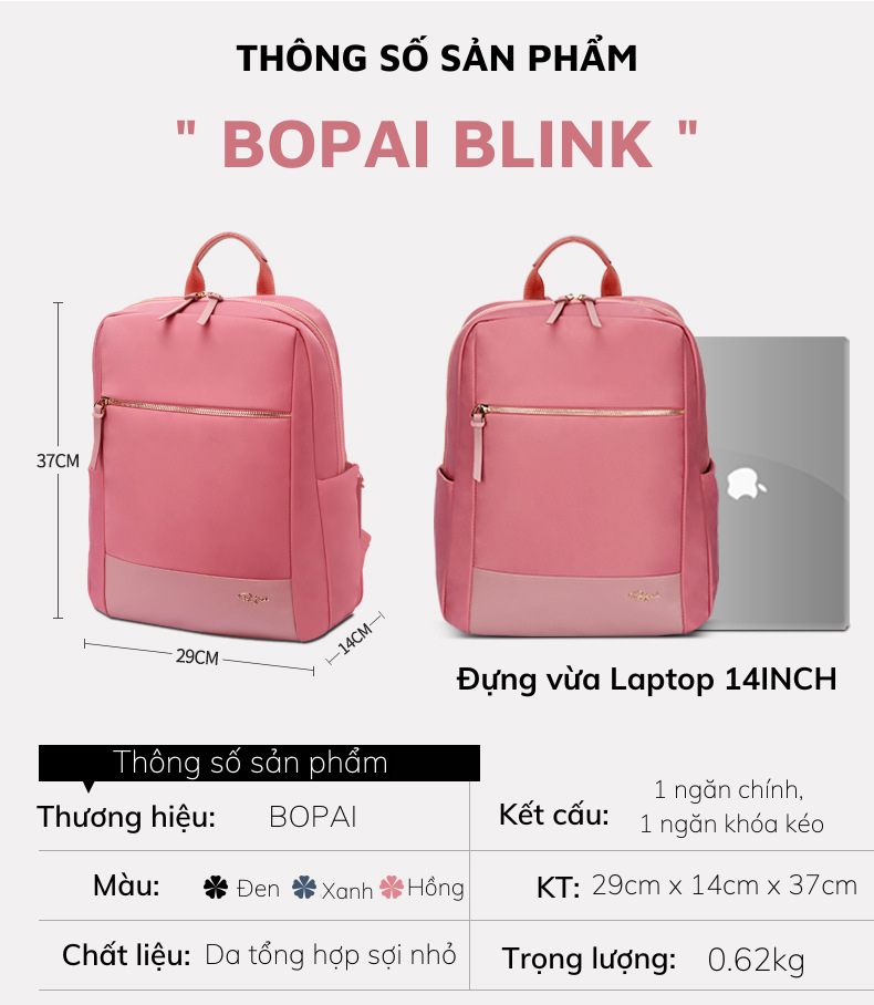 Nhắc đến Bopai là nhắc đến thương hiệu Ý nổi tiếng về các dòng balo cao cấp. Bopai luôn được lòng khách hàng bởi chất lượng, sự đẳng cấp, sang trọng của nó. Và trong đó, dòng balo laptop nữ Bopai Blink đang được các chị em nồng nhiệt săn đón.