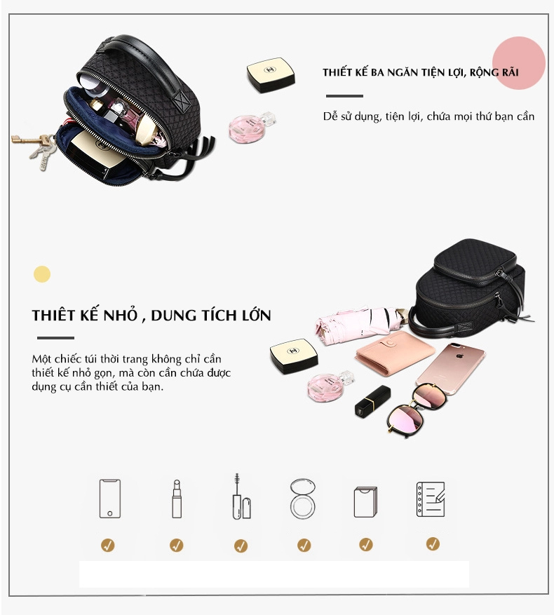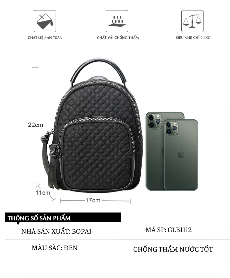 Kích thước: 22 * 11 * 17 cm khá nhỏ gọn phù hợp với nhiều mục đích khác nhau như: đi chơi, đi học, đi làm, đi du lịch,…Thiết kế bao gồm 3 ngăn tiện lợi và rộng rãi.