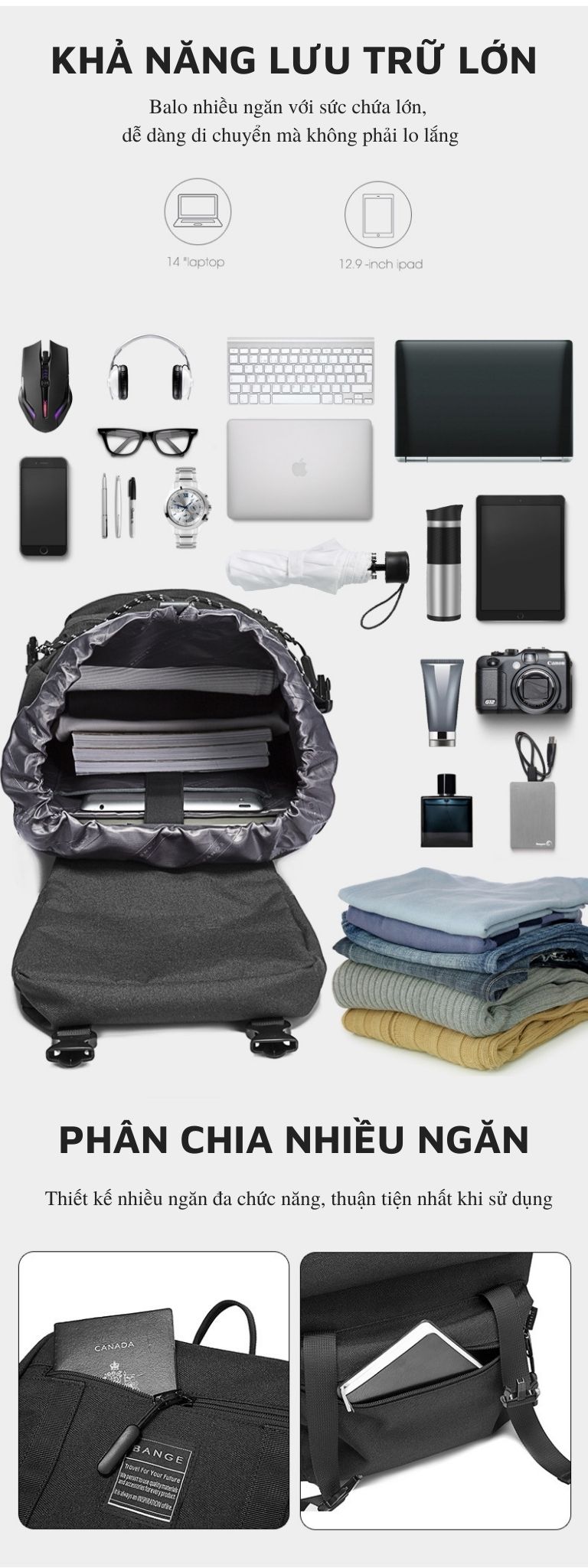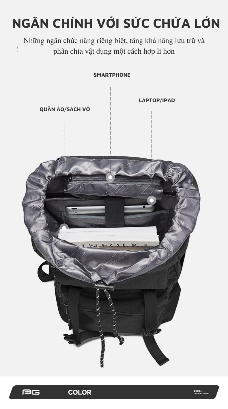 Sở hữu kích thước 48 cm * 32 cm * 20 cm, với kết cấu gồm 1 ngăn laptop, 1 ngăn ipad, 1 ngăn đựng đồ dùng và các ngăn nhỏ. Khá vừa vặn và gọn gàng để chứa được laptop 14inch, Ipad 12.9inch. Đồng thời việc phân chia thành từng ngăn riêng biệt như thế giúp tiết kiệm không gian và tối ưu hóa diện tích. Ngoài ra, ngăn bên cạnh rất hữu ích dùng để đựng bình nước, ô hay các vật dụng du lịch nhỏ gọn, dễ dàng lấy nhanh chóng.