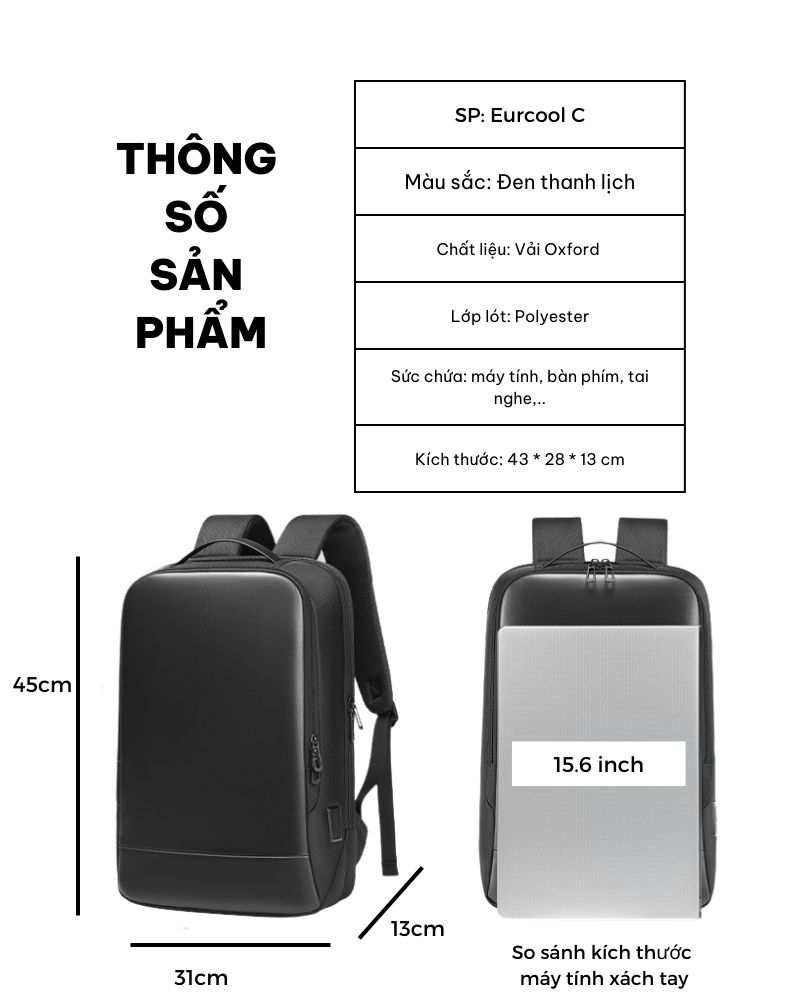 Eurcool luôn đem tới sự hứng thú cho tất cả mọi người mỗi lần tung ra sản phẩm mới cùng những tính năng động đáo và mới lạ. Gần đây nhất là Eurcool C - chiếc balo laptop giá rẻ cao cấp được tích hợp rất nhiều tính năng tuyệt vời mà bạn không nên bỏ lỡ. Bề ngoài sở hữu một màu đen trưởng thành, nam tính, thanh lịch và vô cùng sang trọng đem tới đẳng cấp khác cho người sử dụng.