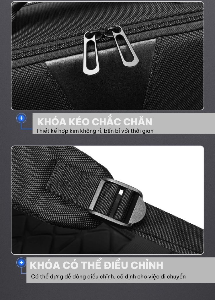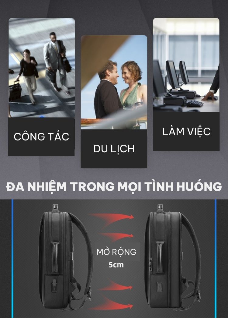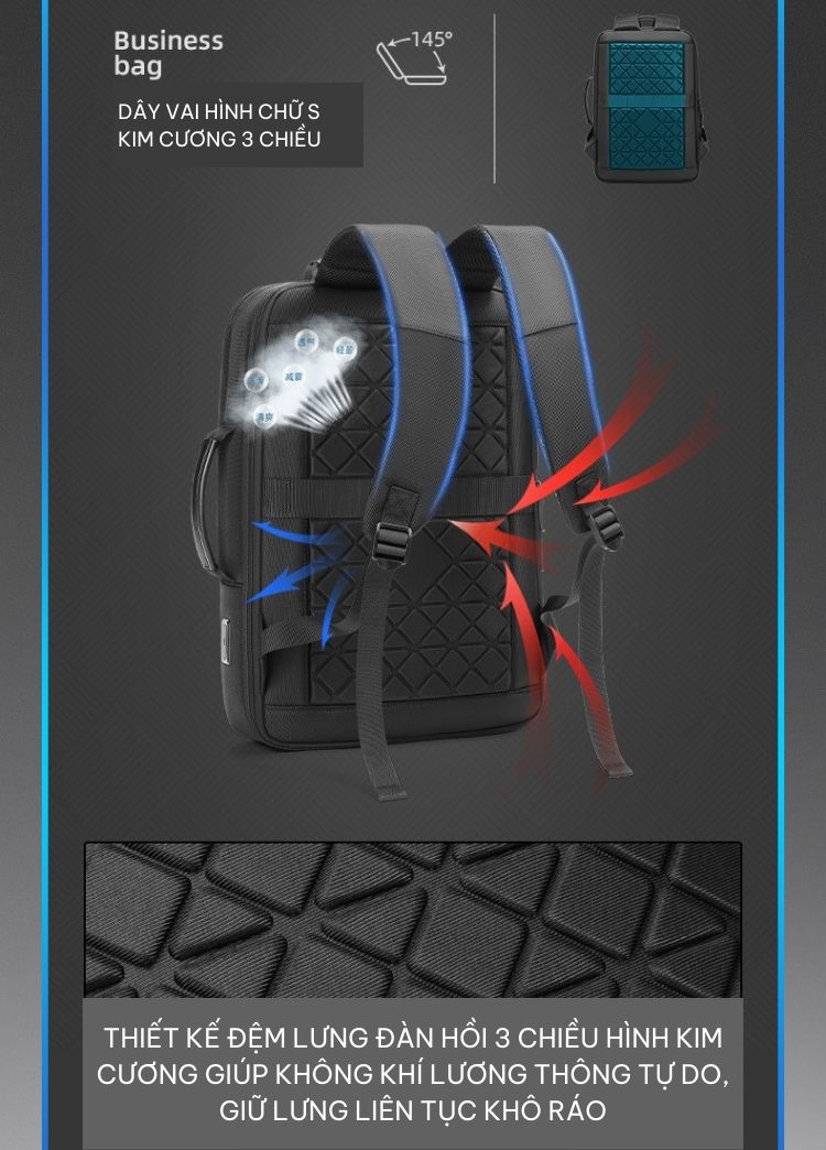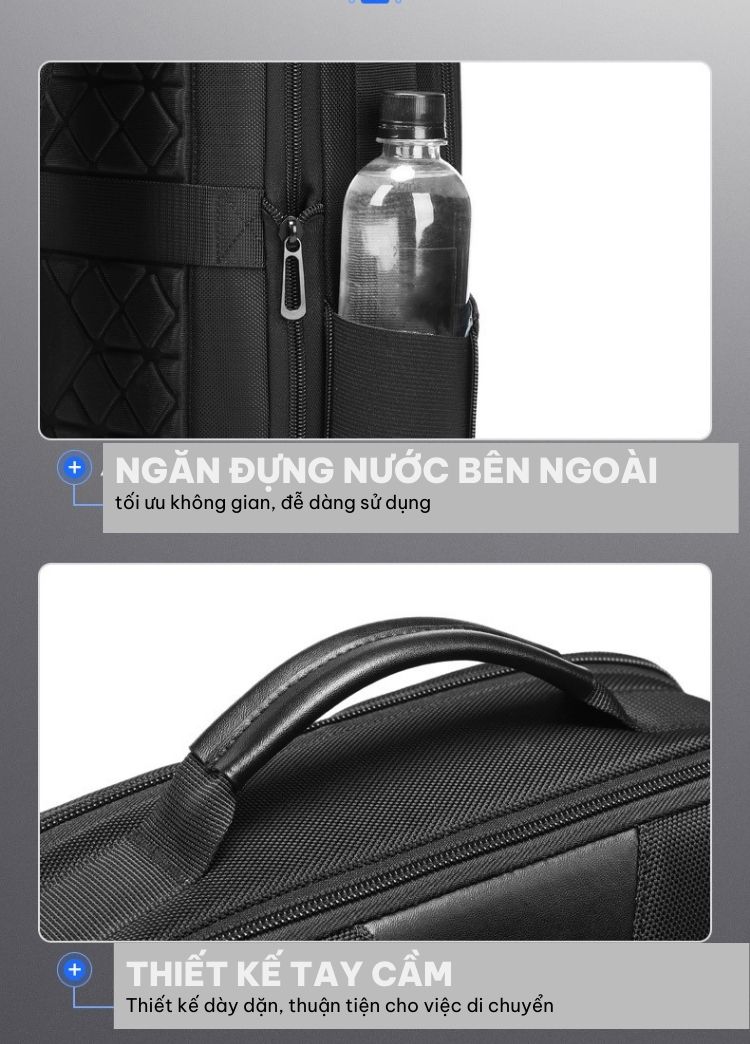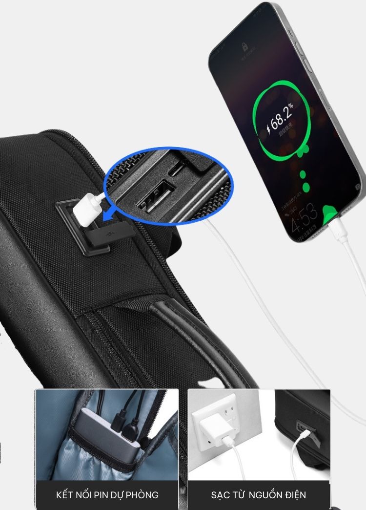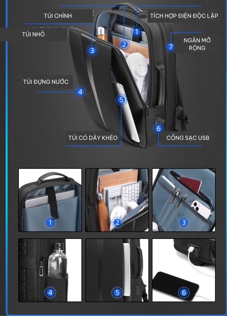 Các ngăn được phân bố hợp lý giúp tiết kiệm và tối ưu không gian nhất có thể để đựng được lượng đồ lớn. Bên trong gồm 1 ngăn chính chứa đồ và nhiều ngăn phụ khác, đặc biệt còn có ngăn chứa laptop riêng với kích thước lên tới 15.6 inch và ngăn chống trộm chuyên đựng tài liệu quan trọng, sách vở, điện thoại, tiền, thẻ,... Sản phẩm còn được tích hợp cổng sạc USB đi kèm giúp bạn sạc điện thoại nhanh gọn, tiện lợi mọi lúc mọi nơi.