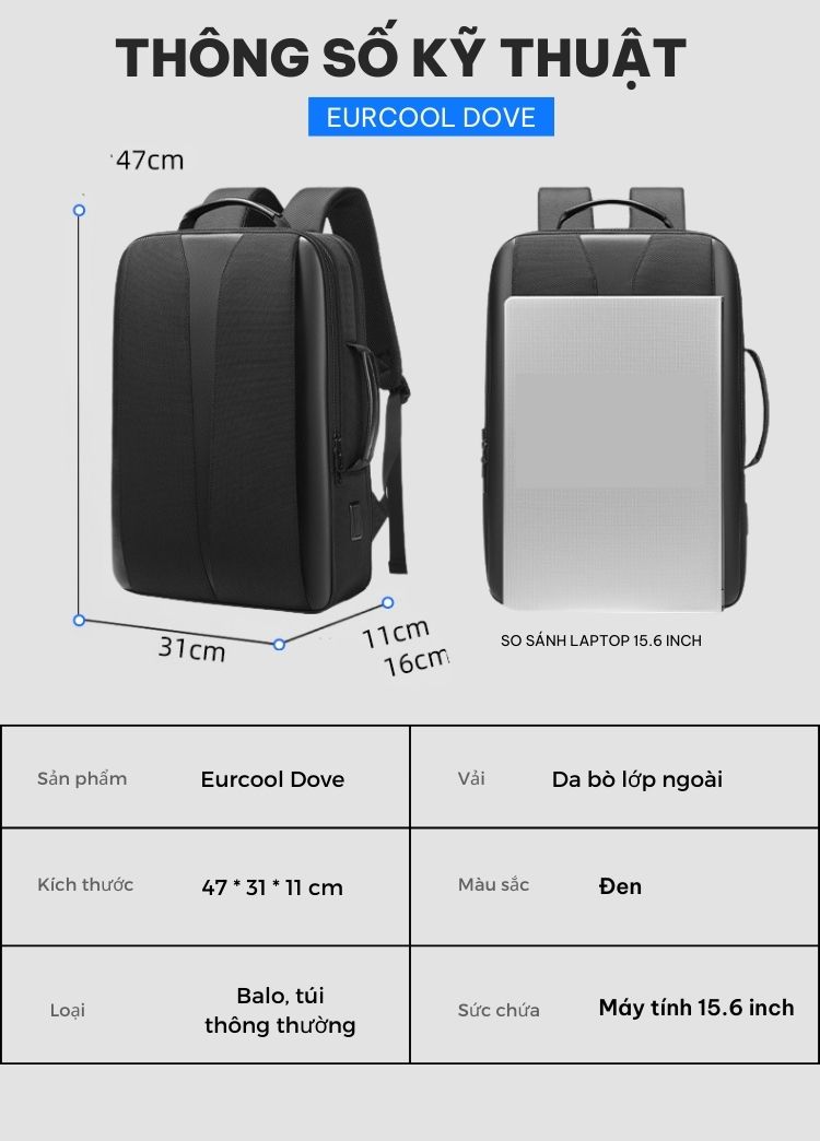 Với cái nhìn đầu tiên, bạn có thể thấy ngay sự hiện đại và sang trọng từ vẻ ngoài của chiếc balo Eurcool Dove. Đây là chiếc balo chính hãng thuộc phân khúc cao cấp, sang trọng mà bạn có thể đem đi học, đi làm hay đi chơi đều thể hiện lên sự trang trọng và lịch thiệp cho chủ sở hữu. Eurcool Dove sở hữu kích thước 47cm x 31cm x 11cm cùng trọng lượng 1 kg đem tới khả năng chứa đựng lượng đồ lớn tùy vào nhu cầu của bạn.