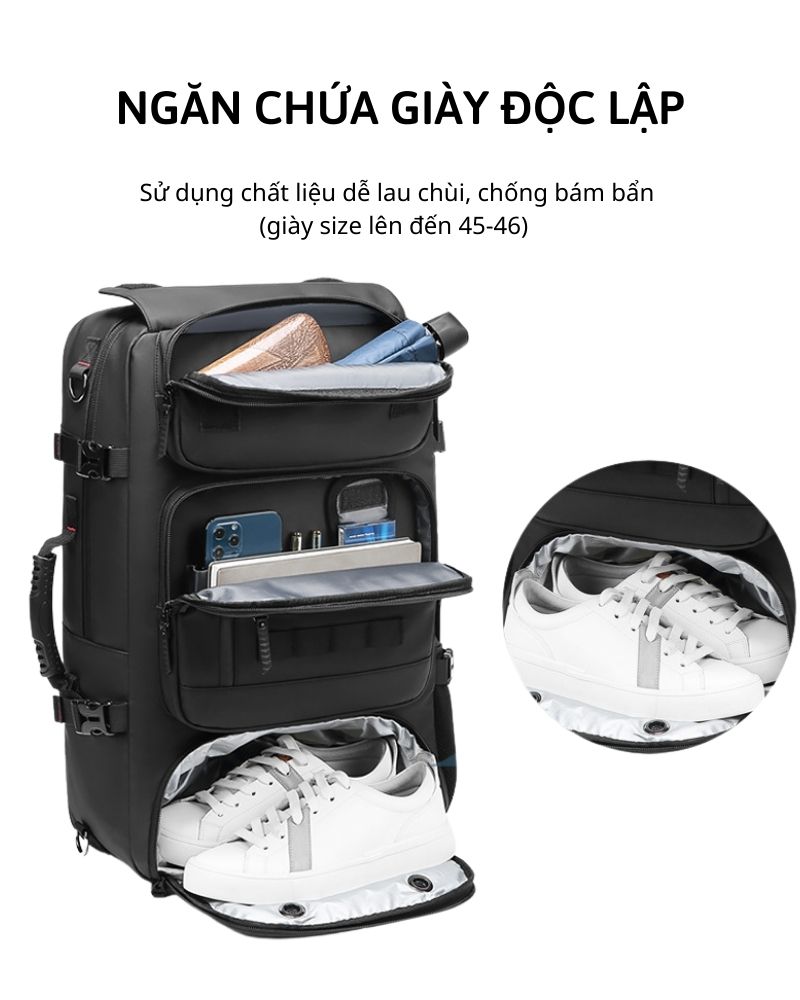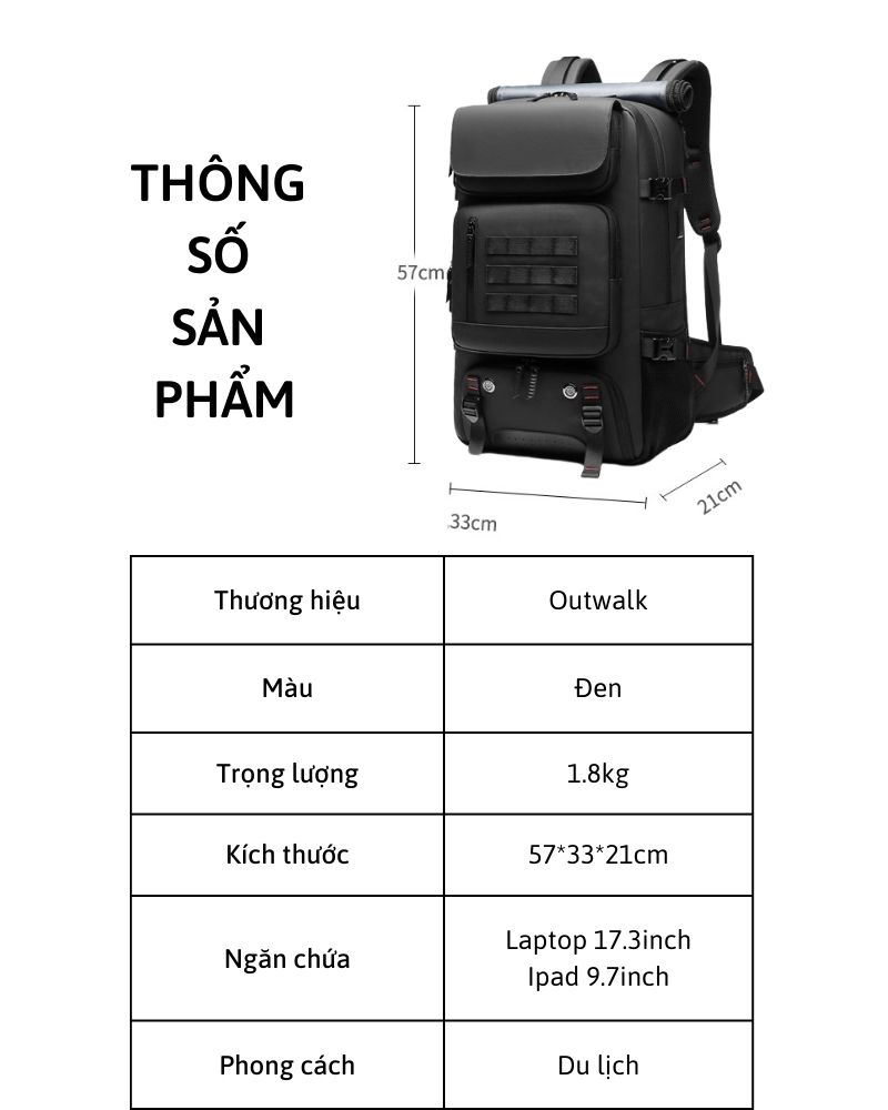 Chiếc balo đi phượt có kích thước khá lớn (57*21*31 cm), có thể đựng được mọi vật dụng cần thiết cho một chuyến đi phượt. Bên cạnh ngăn chứa chính có kích thước đựng vừa một chiếc laptop 17.3 inch, Outwalk Martin còn có vô số ngăn phụ khác được thiết kế cả bên trong lẫn bên ngoài, giúp bạn tối ưu được lượng đồ đạc nhiều nhất có thể. Khả năng chống nước là tiêu chí không thể thiếu đối với bất kỳ loại balo phượt nào và balo chống nước tuyệt đối này đã làm rất tốt điều đó. Với chất liệu vải Oxford cao cấp, có khả năng chống nước, chống thấm và chống sờn rách cực cao.