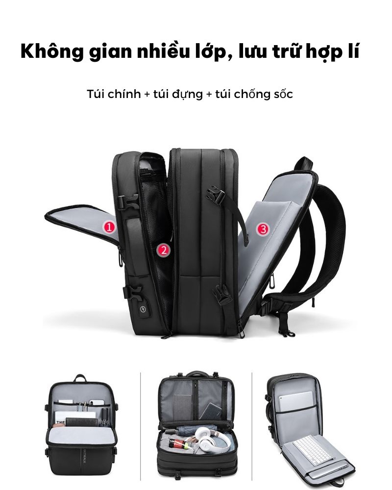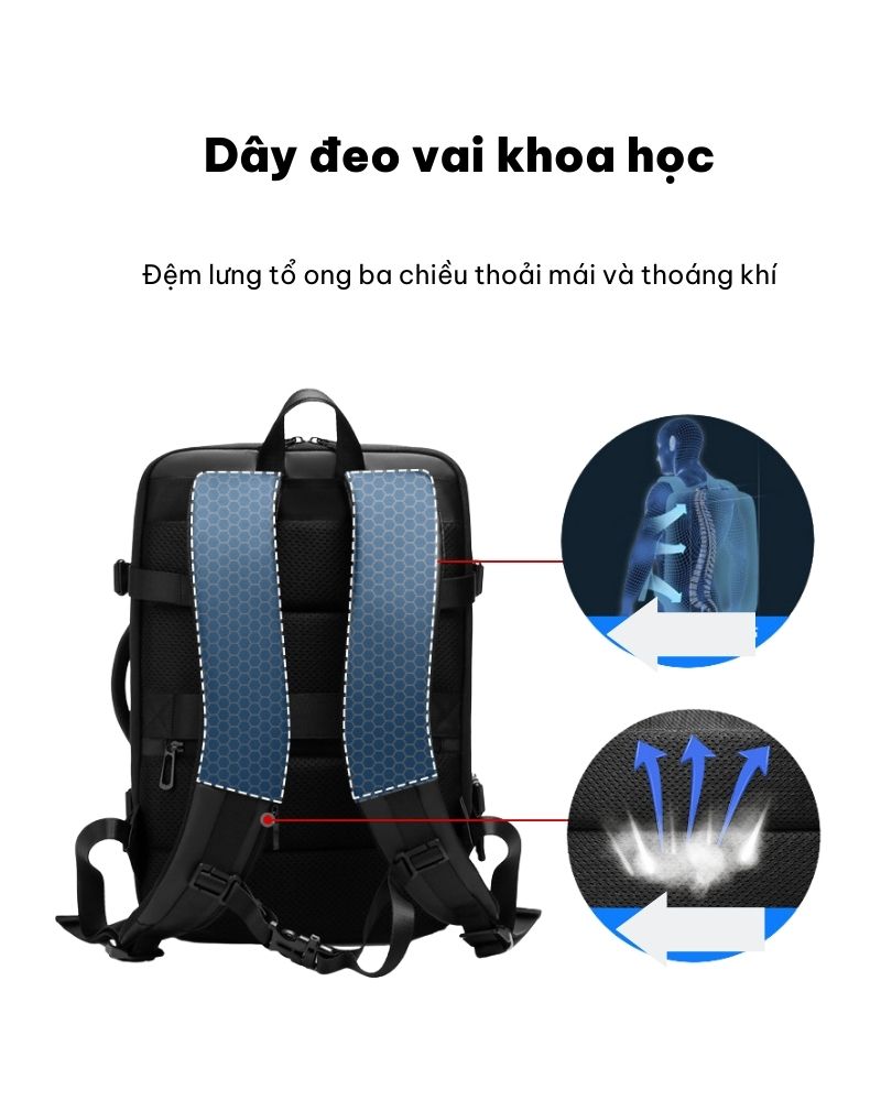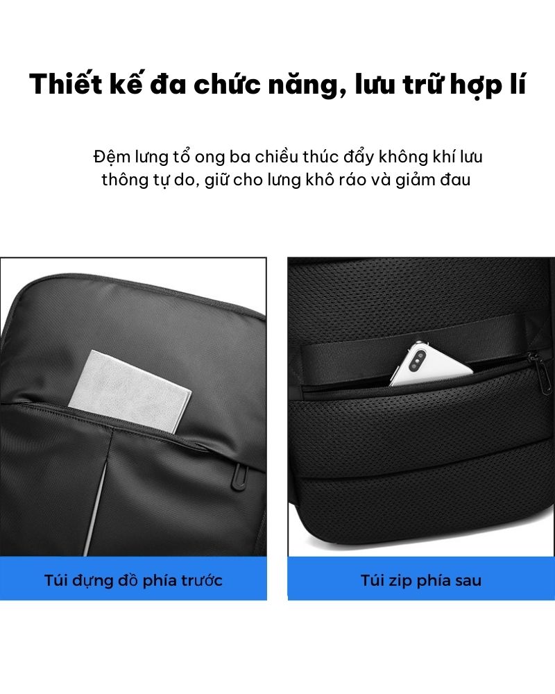 Các ngăn được thiết kế cực kỳ hợp lý, giúp tối ưu tối đa diện tích chứa đồ. Đặc biệt, ngăn chứa của laptop được tích hợp túi chống sốc với kích thước tới 15,6 inch tương tự như balo laptop 15.6 inch cùng phần quai cố định cực chắc chắn. Đệm lưng tổ ong ba chiều thoáng khí, thúc đẩy không khí lưu thông tự do. Giữ cho lưng luôn được khô ráo và giảm lực tác động lên vai, lưng.