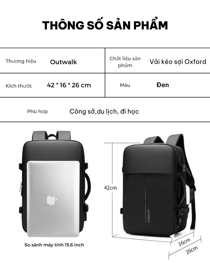 Balo Outwalk Pull - Một sản phẩm cao cấp tới từ nhà Outwalk với lối thiết kế mới lạ, một sức hút mới, một sự đột phá mới mẻ cho những dòng balo laptop cao cấp. Kích thước 42*26*16 cm cùng khối lượng 1.1 kg đem tới tải trọng lớn lên tới 15kg. Được tạo nên từ chất vải cao cấp Oxford không thấm nước và dễ dàng lau chùi, vệ sinh bằng khăn mềm.