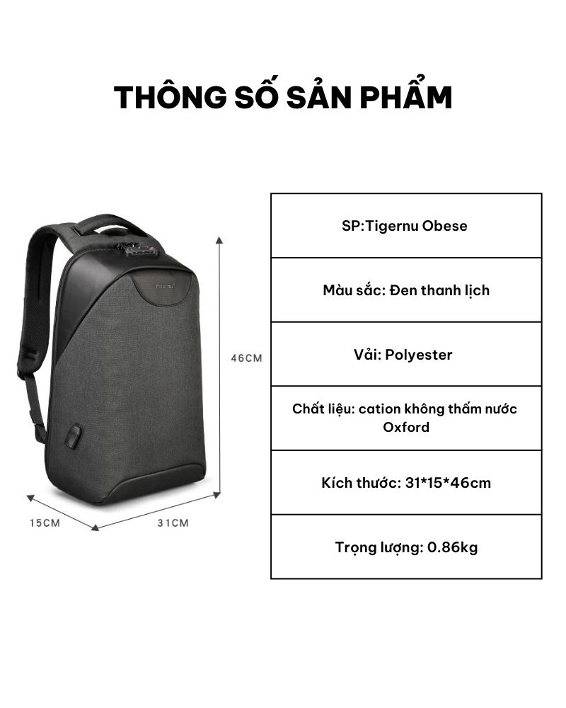 Nghe cái tên thôi là chúng ta đã biết được rằng công dụng nổi bật của em nó chính là khả năng chống trộm vượt trội. Balo Tigernu Obese với thiết kế chỉ có một ngăn chính kết hợp ổ khóa bảo mật, chống trộm ngay phần khóa kéo giúp tăng sự an toàn đến tối ưu cho chủ nhân sử dụng chúng. Nghe đến đây thì có lẽ các bạn nghĩ rằng chiếc balo này chỉ tốt ở khoản chống trộm chứ còn tiện ích về sức chứa thì còn hạn chế nhưng không phía bên trong ngăn chính là những ngăn nhỏ khác được bố trí trải khắp chu vi của chiếc balo. Không những thế, nhà sản xuất còn thiết kế hẳn một ngăn đựng laptop 15.6inch cho bạn thoải mái với việc đi công tác.