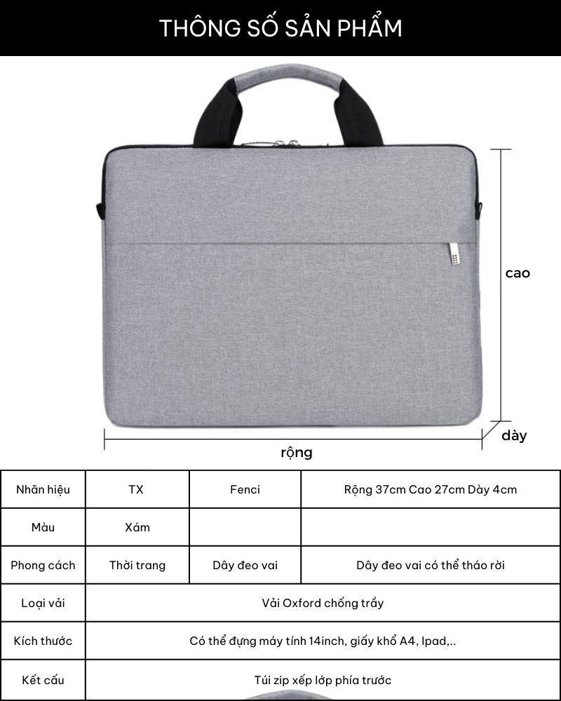TX Fenci sở hữu kích thước là 37*27*4 cm cùng khối lượng cực kỳ nhẹ chỉ 0.18 kg nhưng đừng vì vậy mà coi thường khả năng bảo vệ laptop của em nó nhé. Bên trong sản phẩm được thiết kế với ngăn chứa lớn có thể đựng được laptop có kích thước 14 inch. Bảo vệ an toàn cho chiếc laptop thân yêu của bạn, tránh tình trạng laptop bị trầy xước, giảm lực tác động lên laptop nếu bạn vô tình làm rơi rớt hay va đập mạnh.
