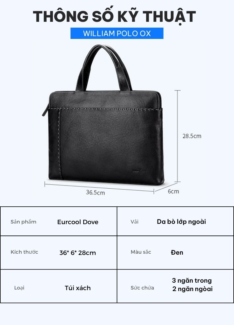 Với kích thước: 36cm x 6cm x 28cm hợp với thiết kế đa ngăn, chiếc túi cực kì vừa tay người dùng, không quá to nhưng cũng không quá nhỏ rất thuận tiện để mang đi, để đựng những tài liệu, những đồ dùng cần thiết. Hơn nữa, William Polo Ox còn có cả ngăn đựng laptop riêng 13,3inch lại càng tăng sự thích hợp khi đi làm cho các quý ông.
